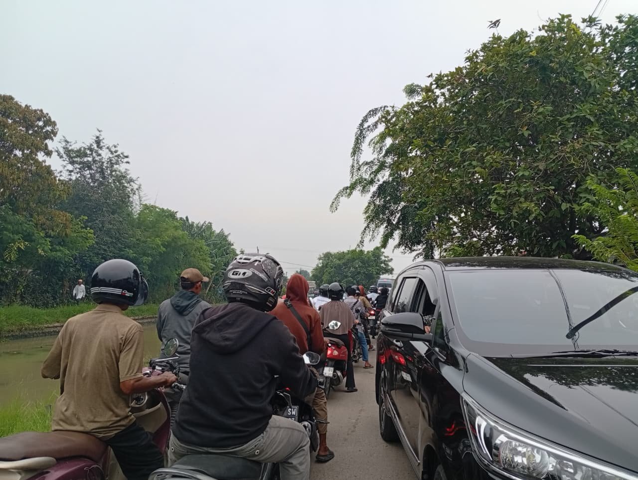 Alih-alih berjalan tertib, arus kendaraan di jalur menuju Cilebar justru bercampur tanpa skema pengalihan yang jelas. Akibatnya, kemacetan tak terhindarkan. Sejumlah warga bahkan melaporkan insiden nyaris celaka, ketika seorang pejalan kaki tersenggol kendaraan hingga terjatuh di tengah kepadatan arus lalu lintas.