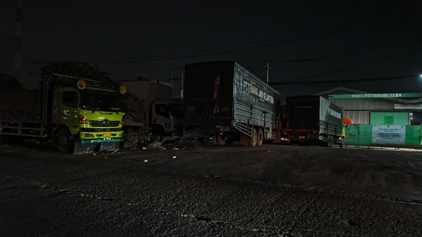 Penyempitan diduga disebabkan parkir liar kendaraan besar, seperti mobil box dan truk kontainer milik PT Tenang Jaya yang menggunakan badan jalan.