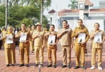 KARAWANG | TERASPASUNDAN.COM – Bupati Karawang H. Aep Syaepuloh memimpin apel pagi di lingkungan kantor bupati sekaligus memberikan piagam penghargaan Lomba Desa tingkat Kabupaten (Anugerah Gapura Sri Baduga) yang dilaksanakan di Plaza Pemda, Senin (6/10/25).
