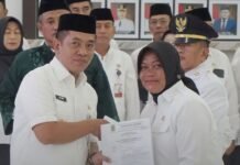 KARAWANG | TERASPASUNDAN.COM – Bupati Karawang Aep Syaepuloh melantik dan mengambil sumpah jabatan terhadap 63 pejabat di lingkungan Pemerintah Kabupaten Karawang. Pelantikan tersebut meliputi Pejabat Administrator, Pejabat Pengawas, serta penugasan tambahan, yang digelar di Aula Husni Hamid, Senin (5/1/2026).