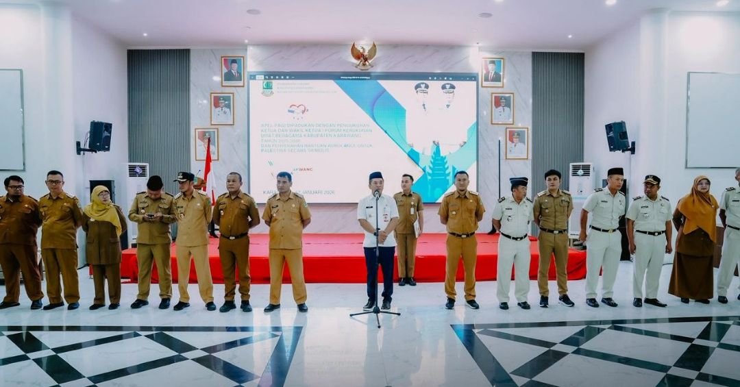 KARAWANG | TERASPASUNDAN.COM – Bupati Karawang, H. Aep Syaepuloh, S.E., secara resmi mengukuhkan kepengurusan Forum Kerukunan Umat Beragama (FKUB) Kabupaten Karawang masa bakti 2025–2030. Pengukuhan dilaksanakan bersamaan dengan apel pagi di lingkungan Sekretariat Daerah Kabupaten Karawang, Senin (12/1/2026), bertempat di Aula Husni Hamid.