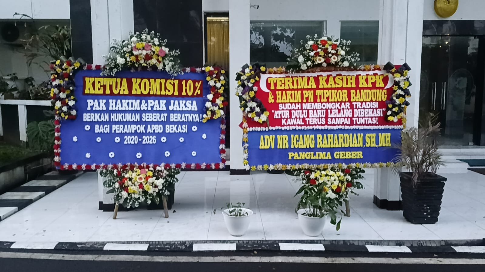 Salah satu pesan mencolok datang dari Adv. NR Icang Rahardian, SH., MH, yang juga dikenal sebagai Panglima GEBER. Dalam pesan yang tertulis di karangan bunga tersebut, ia menyampaikan apresiasi mendalam kepada lembaga antirasuah dan perangkat hukum yang bertugas.