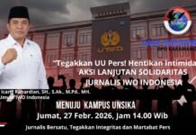 JAKARTA, TERASPASUNDAN.COM – Dewan Pimpinan Pusat (DPP) Ikatan Wartawan Online Indonesia (IWOI) resmi mengeluarkan instruksi kepada seluruh jajaran pengurus dan anggota di Indonesia untuk menggelar Aksi Nasional Bela Jurnalis di depan Kampus Universitas Singaperbangsa Karawang (UNSIKA), Jumat, 27 Februari 2026 pukul 14.00 WIB hingga selesai.