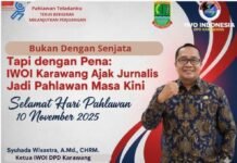 KARAWANG | TERASPASUNDAN.COM –Memperingati Hari Pahlawan yang jatuh pada 10 November 2025, Ikatan Wartawan Online Indonesia (IWOI) Dewan Pimpinan Daerah (DPD) Kabupaten Karawang mengajak seluruh insan pers, khususnya jurnalis media online, untuk meneladani semangat perjuangan para pahlawan melalui karya jurnalistik yang bermakna, bertanggung jawab, dan menginspirasi.