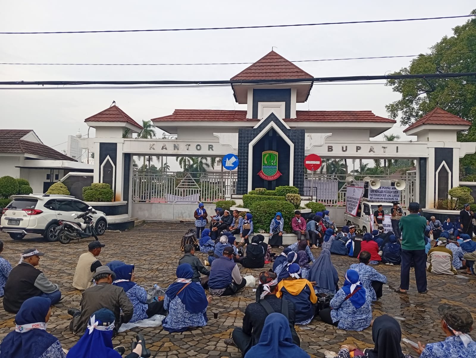 KARAWANG | TERASUNDAN.COM — Ribuan purnabakti Aparatur Sipil Negara (ASN) menggelar aksi unjuk rasa di halaman Kantor Korpri Karawang, Senin (12/1/2026). Aksi tersebut merupakan bentuk protes atas belum direalisasikannya pencairan penuh dana kadeudeuh pensiunan yang dinilai dipotong sepihak.