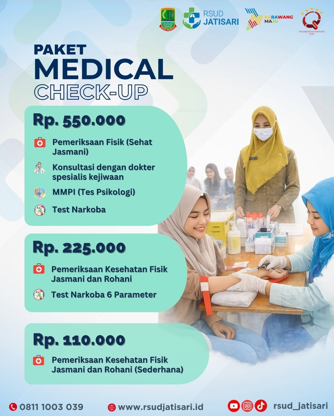 Dalam program tersebut, RSUD Jatisari menawarkan beberapa pilihan paket pemeriksaan kesehatan dengan fasilitas yang lengkap dan ditangani tenaga medis profesional.