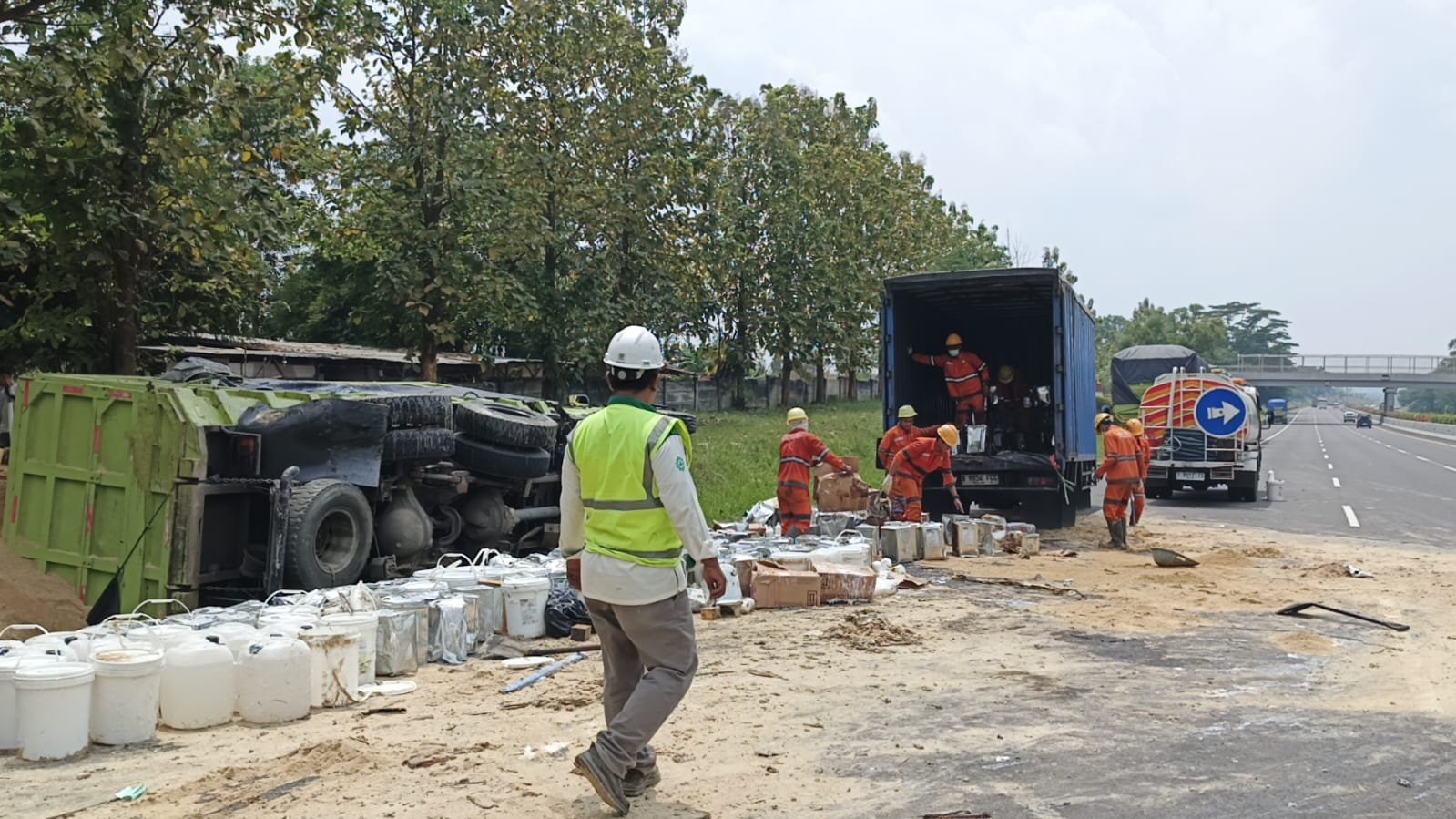 Dari pantauan di lokasi, truk bermuatan pasir tampak terguling di bahu jalan dengan kondisi sebagian muatan pasir tumpah ke aspal. Serupa, muatan truk kontainer berupa lem dan bahan kimia pun berserakan di jalan.
